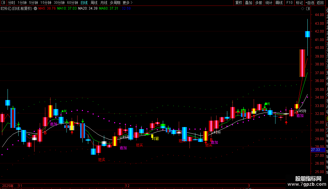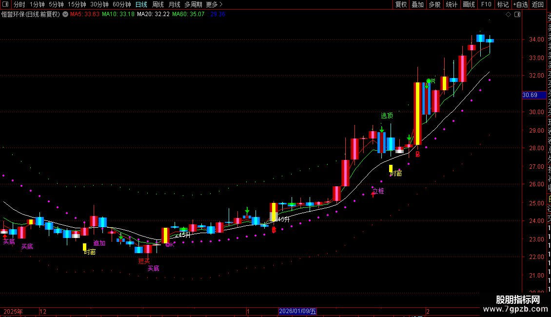 4. 买卖点提示:通过图标(如笑脸、箭头)和文字(如“买底”、“逃顶”、“立桩”、“短买”)标记多种策略产生的买入和卖出信号。