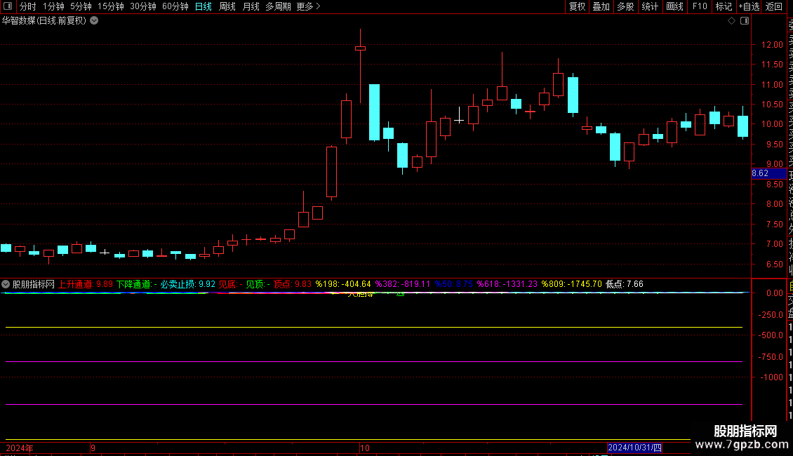 下降通道(绿色粗线):当9日均线向下时显示,代表短期下降趋势。