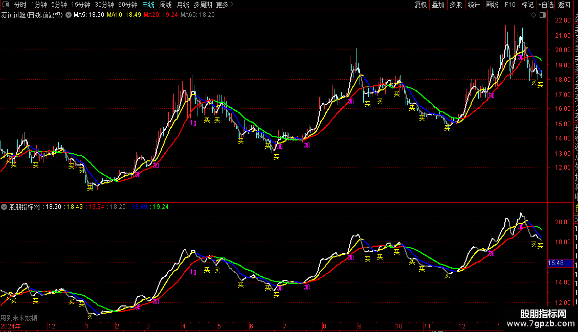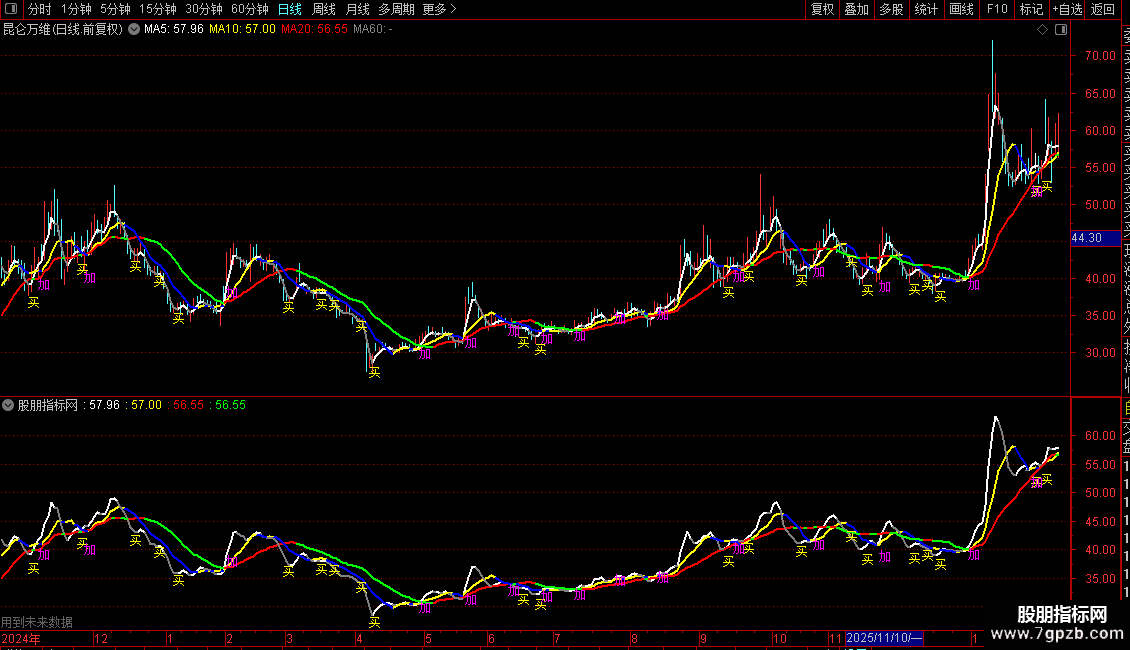 2. 当加仓信号条件成立时,在K线最低价下方2%的位置标注洋红色“加”字。