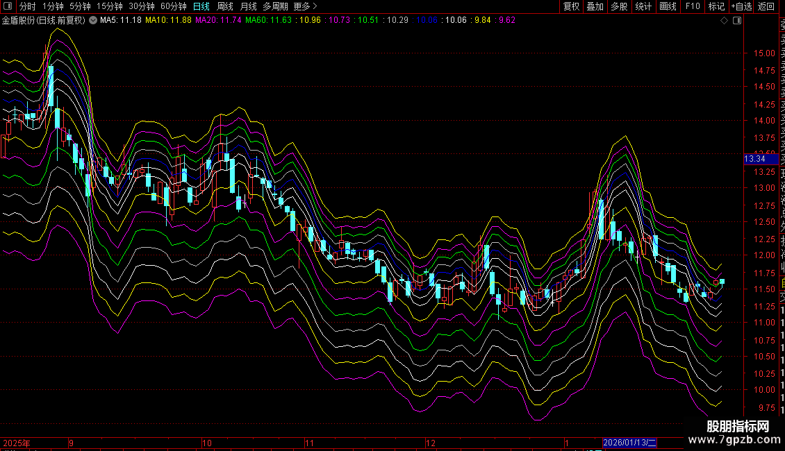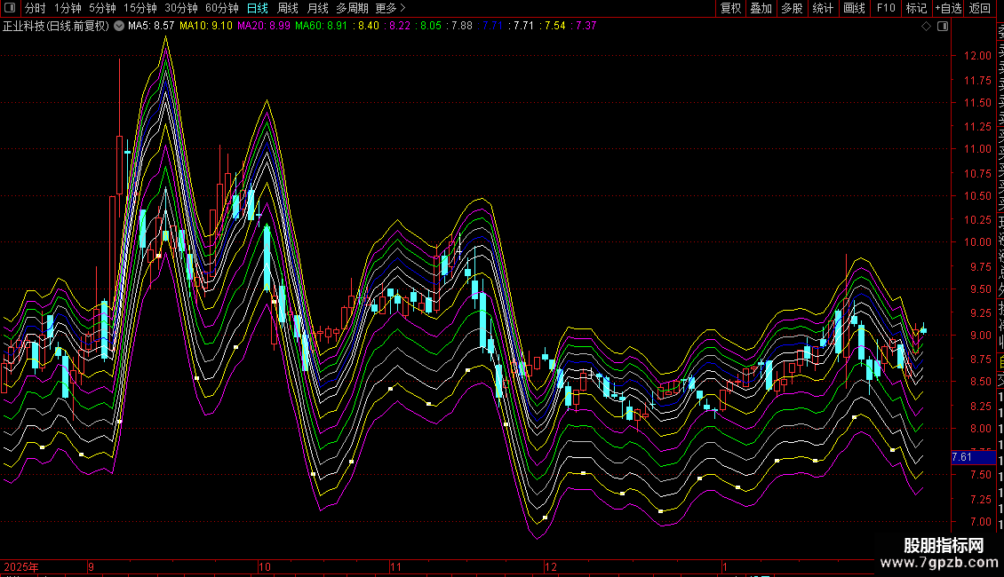总结:指标通过一个独特的算法生成一条动态基准线,并围绕它构建了一个多层次的压力支撑网格系统,用于判断股价运行的强弱区间和潜在的转折点。