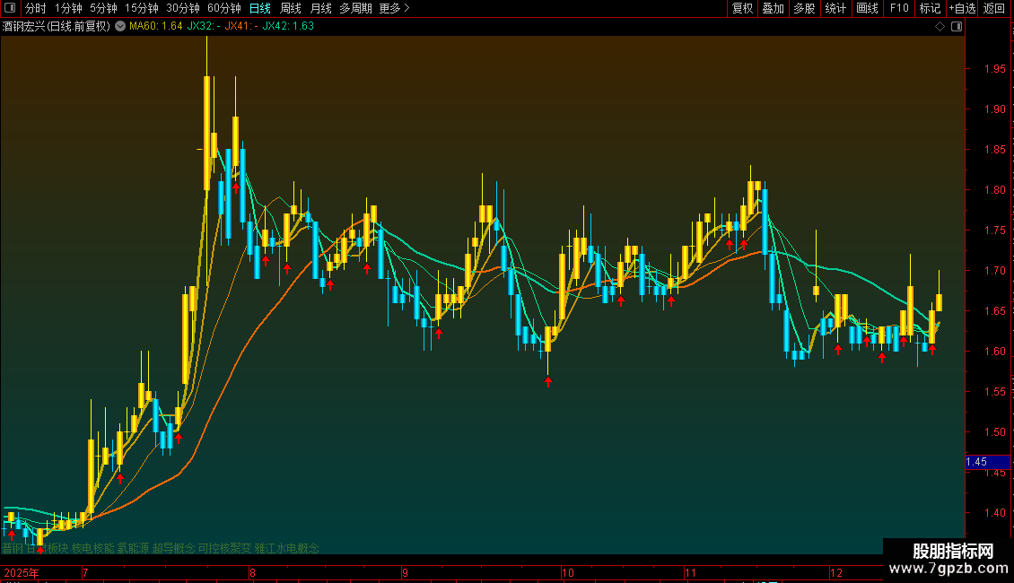 当满足条件S时,在收盘价和开盘价位置之间画柱状线,宽度为0.38,0不为0则画空心柱.,COLOREFDD00
