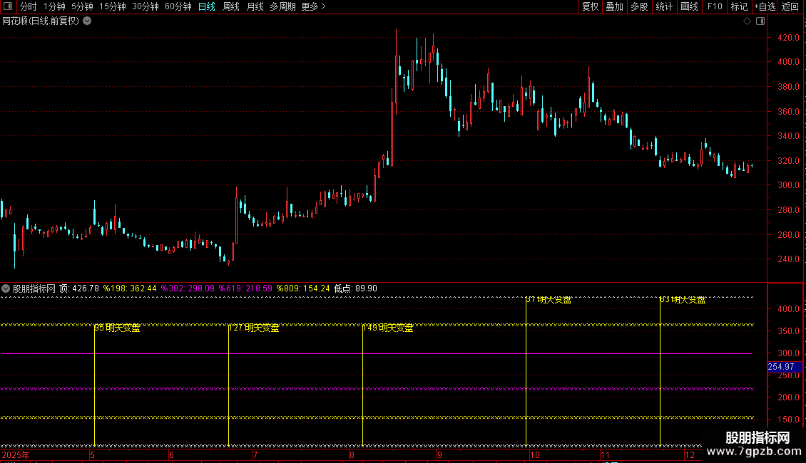 DRAWTEXT(成立距今=(32*8)-1,高-高*0.016,'255 明天变盘'),COLORYELLOW;