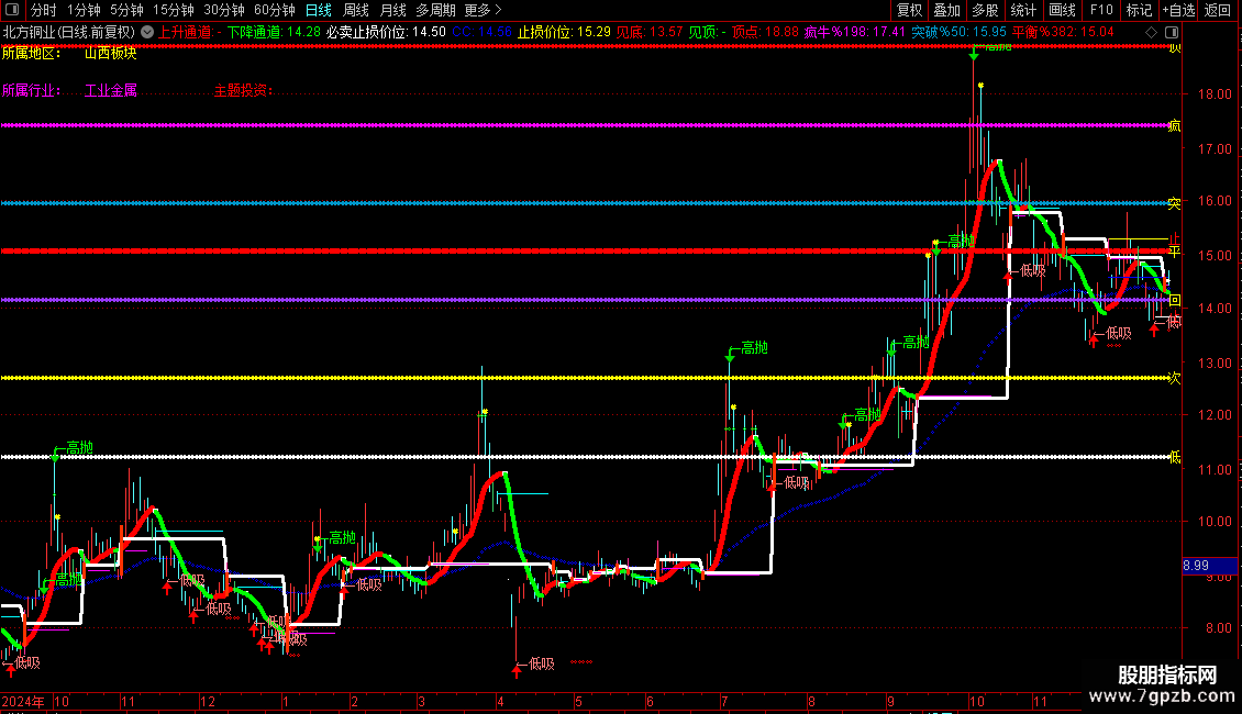 下降通道:IF(VAR11<REF(VAR11,1),VAR11,DRAWNULL),LINETHICK4,COLORGREEN;