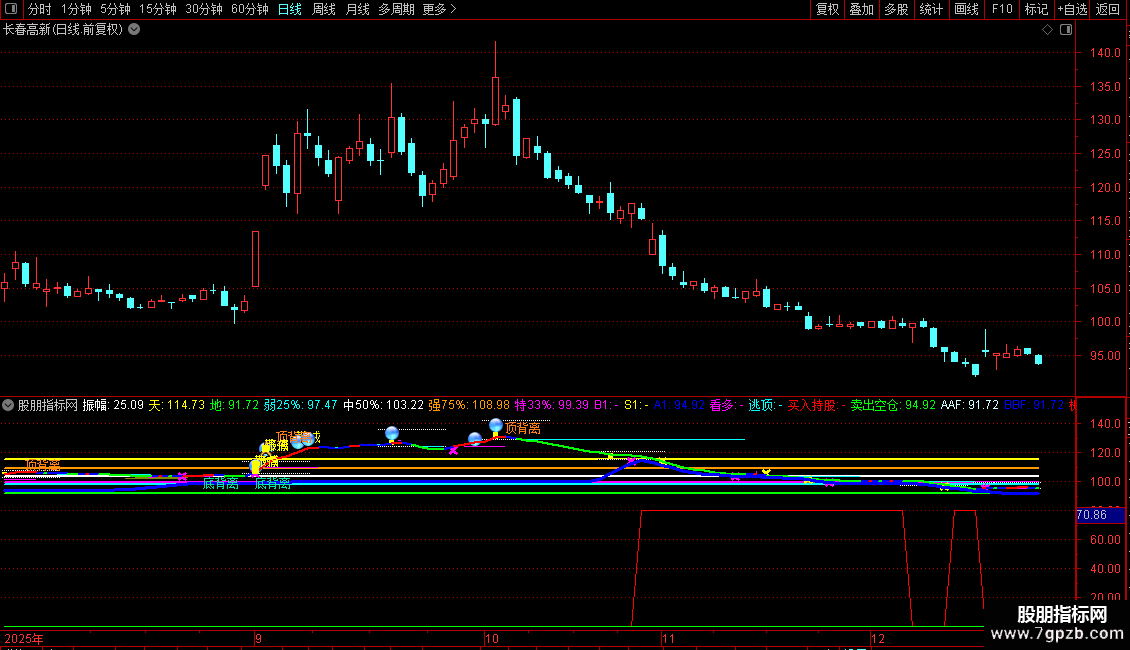输出逃顶:如果A1X<0ANDBARSLAST(0上穿A1X)>0,返回上次0上穿A1X距今天数日前的(收盘价+开盘价)/2,否则返回无效数,画青色,
