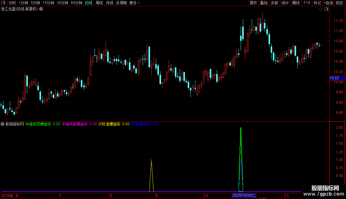 次标准螺旋桨:NOT(GLXJ) AND NOT(DLXJ) AND (H-MAX(C,O))/(H-L)>0.2 AND (MIN(C,O)-L)/(H-L)>0.2 AND (H-L)/O>0.03,COLORYELLOW;