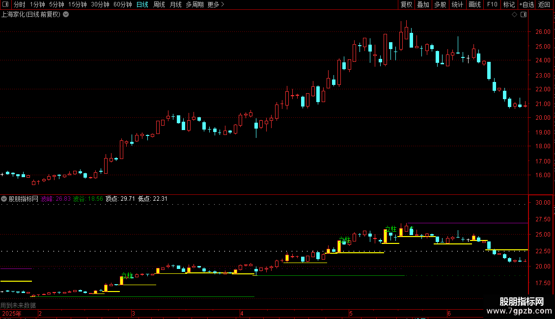 波谷: REF(L,BARSLAST(LD)),POINTDOT,COLOR009900;