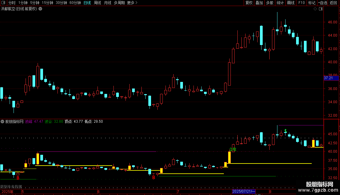 波峰: REF(H,BARSLAST(HD)),POINTDOT,COLOR990099;