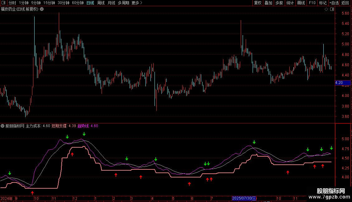 短期支撑:=LLV(HIGH,30),LINETHICK2,COLORLIRED;