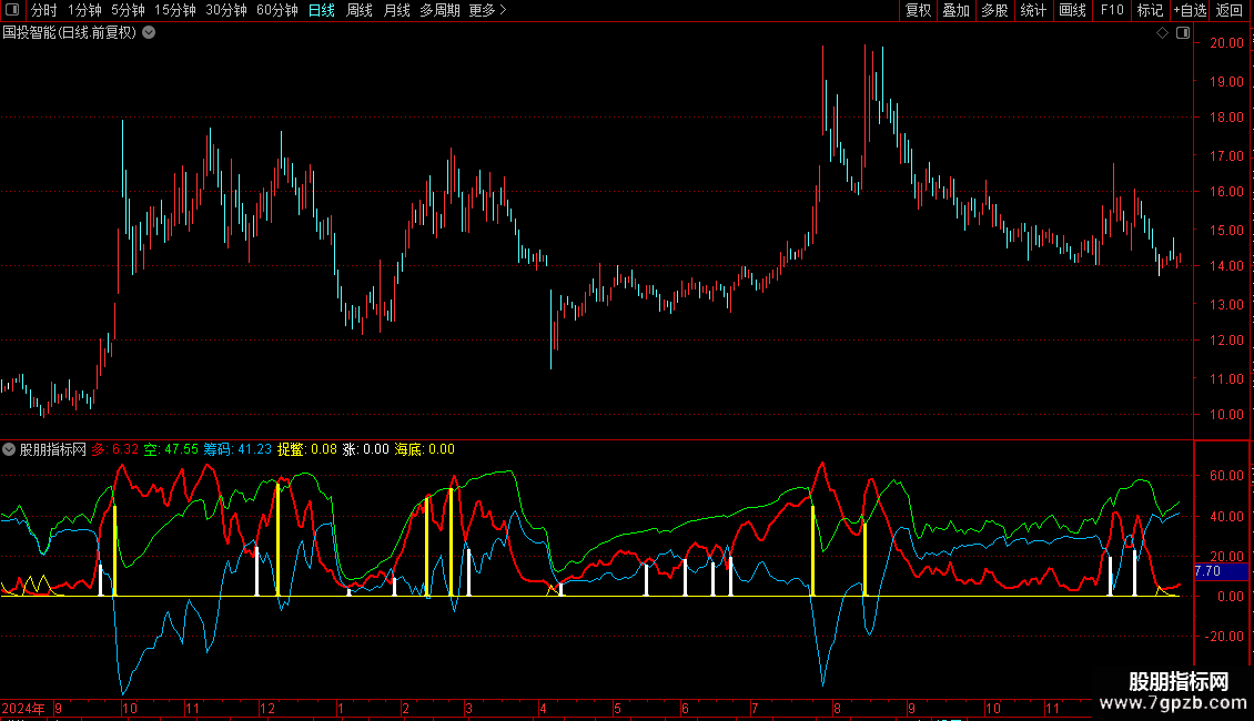 捉鳖:EMA(IF(L<= LLV(L,99),SMA(Abs(L-REF(L,1)),99,1)/SMA(MAX(L-REF(L,1),0),99,1),0)*5,3),COLORYELLOW;