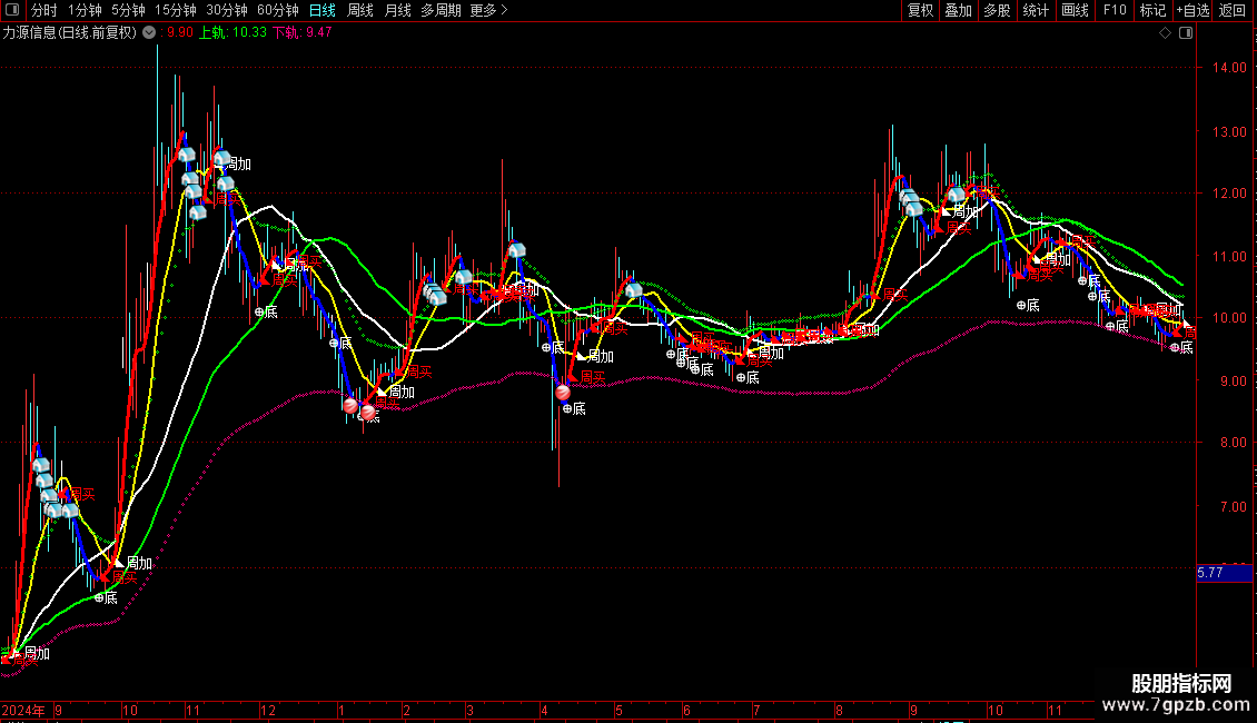 DRAWTEXT(A>=REF(A,1) AND REF(A,1)<REF(A,2),A,'◣周买'),COLORRED;{周线上买入,中期持有,月线上更好}