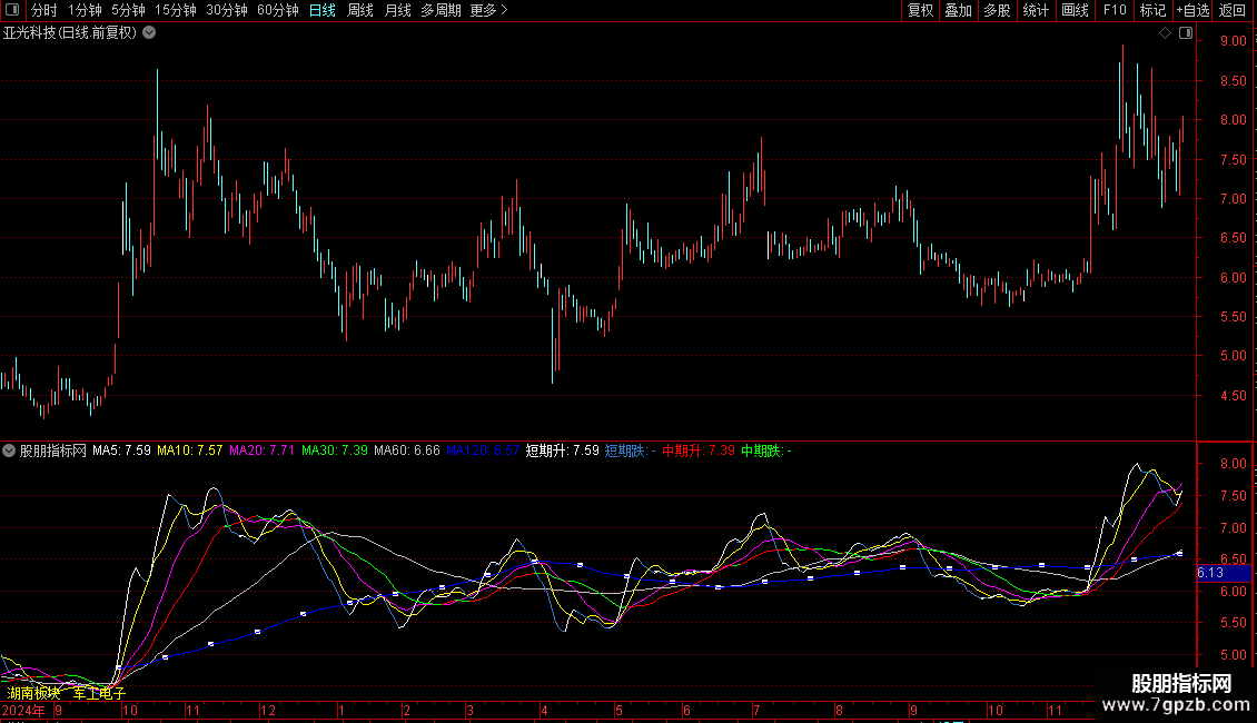 中期升:IF(REF(MA30,1)<MA30,MA30,DRAWNULL),COLORRED;
