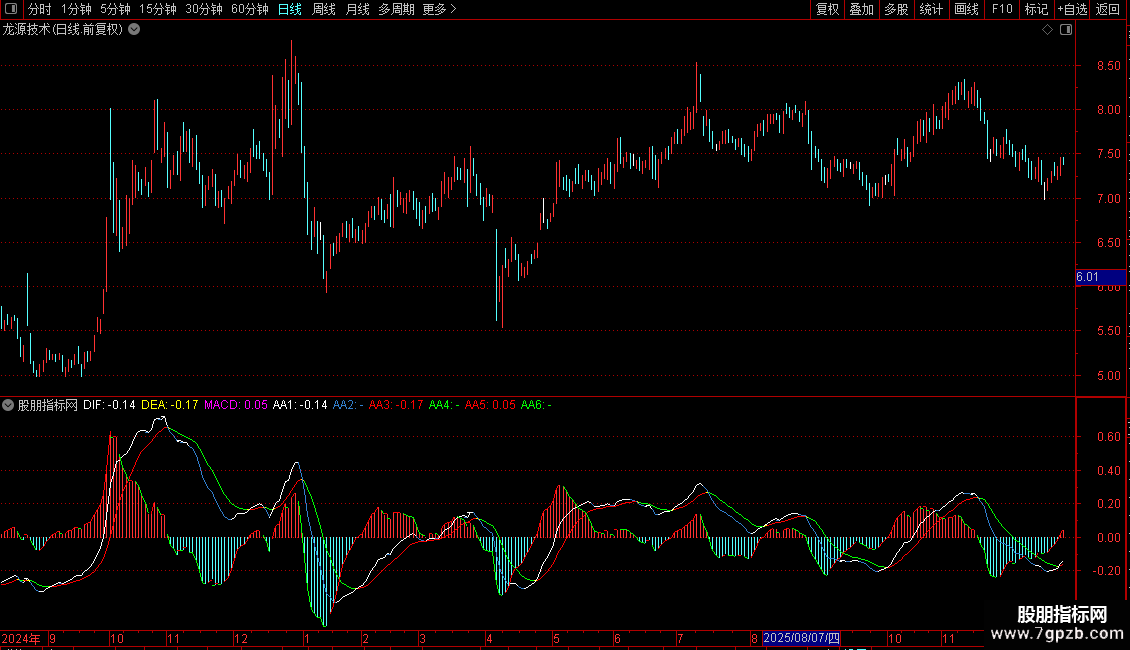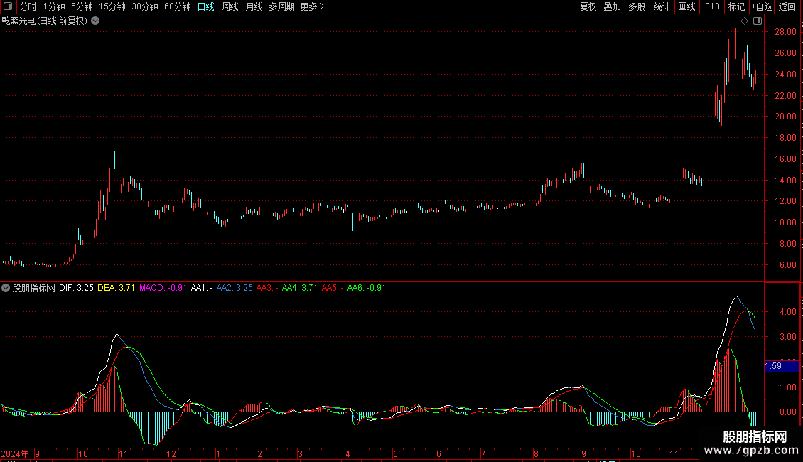 AA6:IF(REF(MACD,1)>MACD,MACD,DRAWNULL),COLORGREEN;