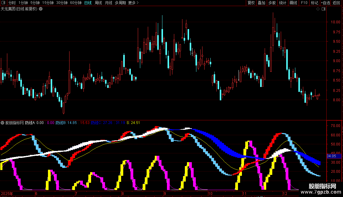 S:=EMA(0.382*REF(防线B,2)+0.618*防线B,12),COLORYELLOW;