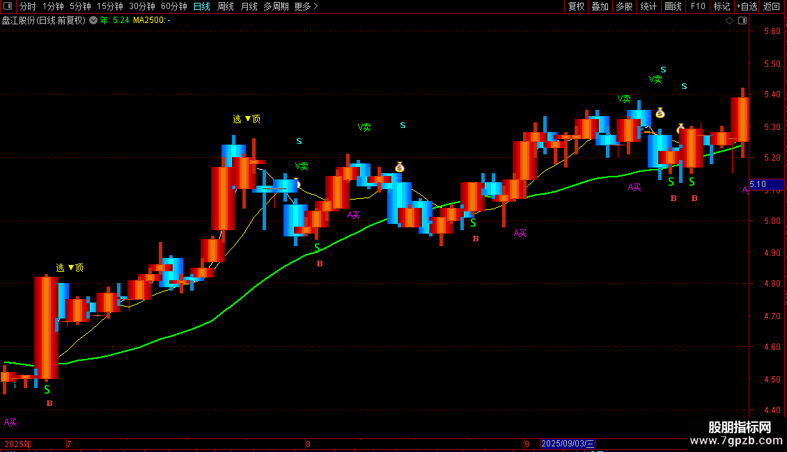 A赋值:S的5日简单移动平均,画绿色,,线宽为2