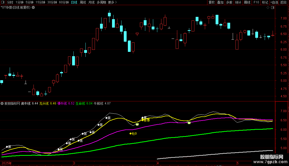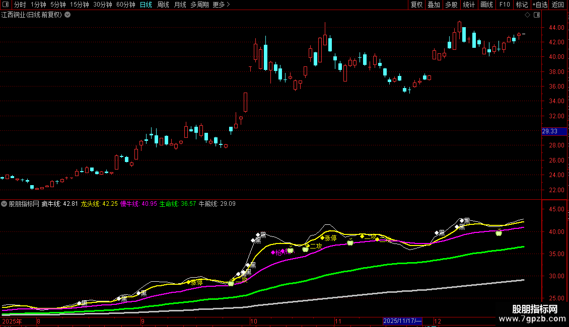 AND UPNDAY(慢牛线,3),LOW*0.97,'◆枪A'),COLORMAGENTA;