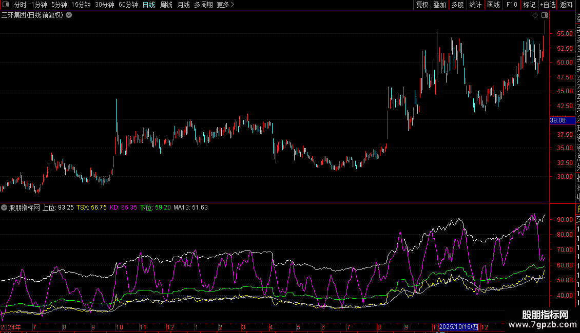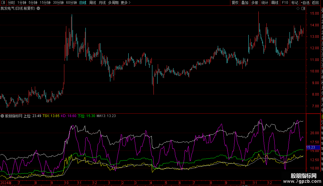 `TSX`(即 `X1`)为核心动态线,结合 `KD` 线、`MA13` 判断趋势方向与强度。