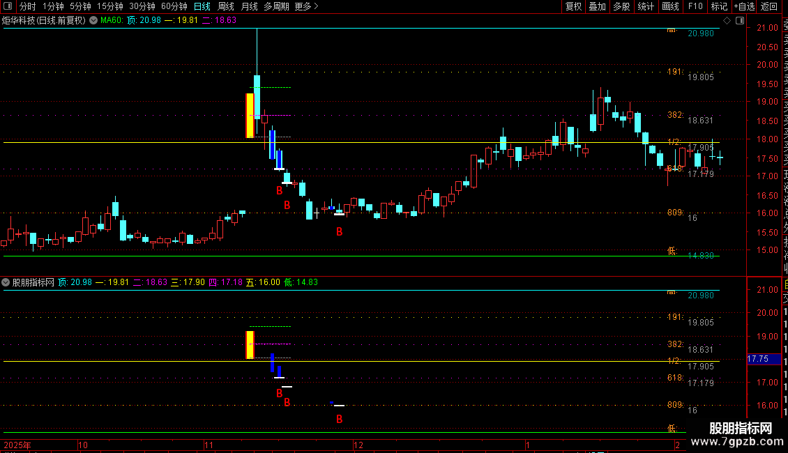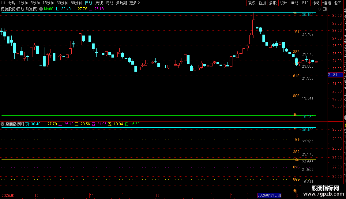 5. 黄金分割位:以150个交易日前的最高、最低价为基准,计算并绘制出该区间内的黄金分割位(0.191, 0.382, 0.5, 0.618, 0.809)以及最高、最低价水平线。这些线以不同颜色和点状线形式水平延伸,作为长期的压力与支撑参考。在K线图最左侧(约第5根K线位置)会标注这些水平线的具体数值和名称。