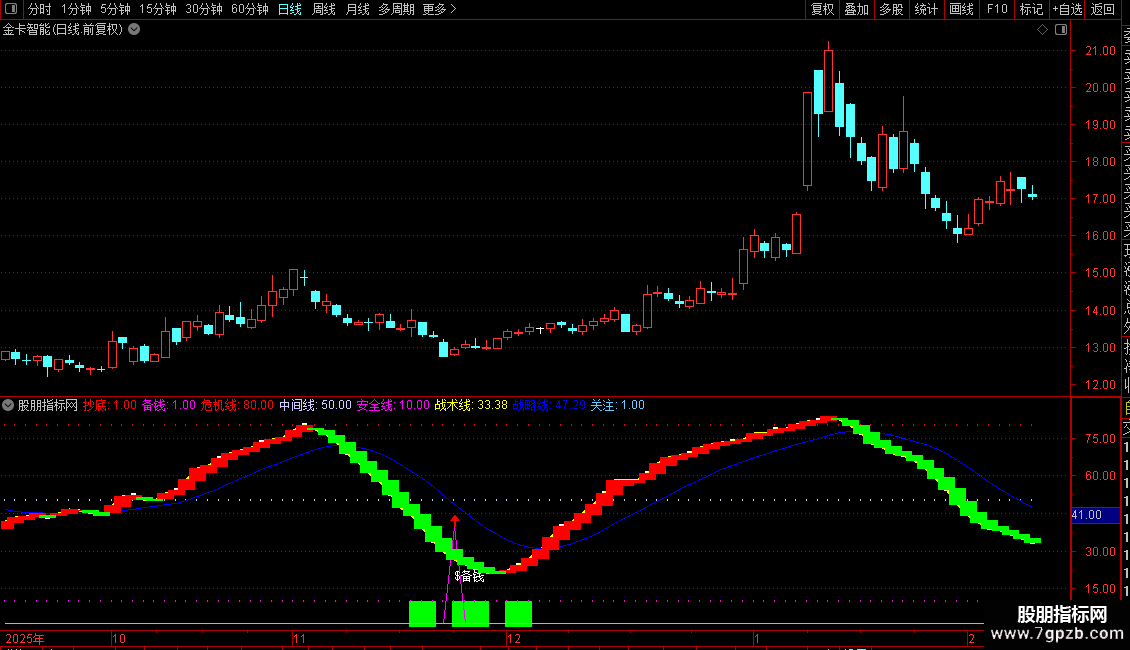 4. J线反弹信号:当J线在低位(小于0)反弹超过1时,显示绿色柱线,提示短期反弹可能。