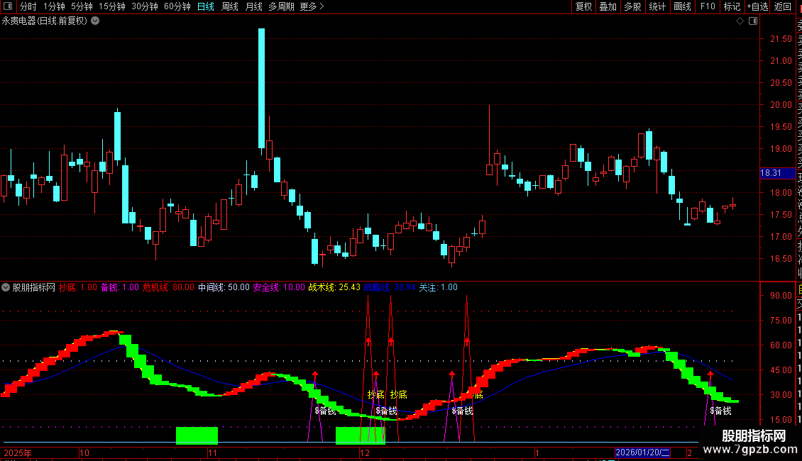 卖出参考:结合“备钱”信号、股价接近或突破“危机线”以及战术线下穿战略线(绿柱出现)使用。