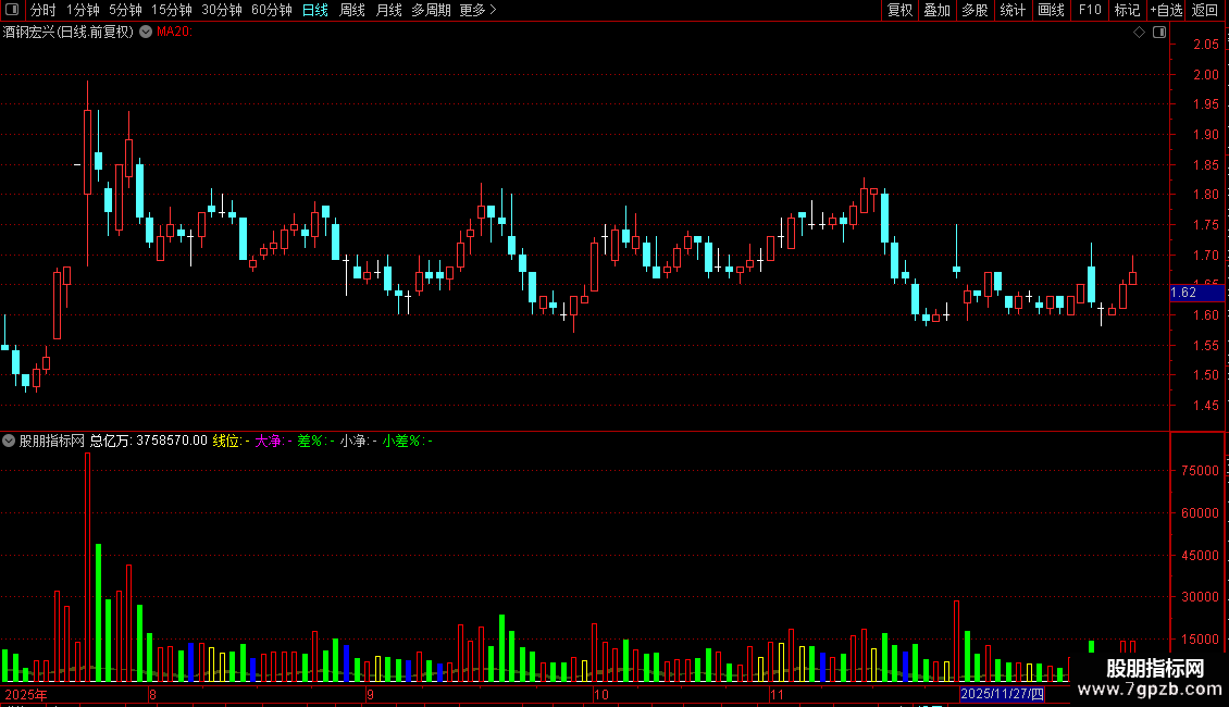 当满足条件负V>大额线时,在0和成交额(元)*100位置之间画柱状线,宽度为1,0不为0则画空心柱.,COLORFFFFFF