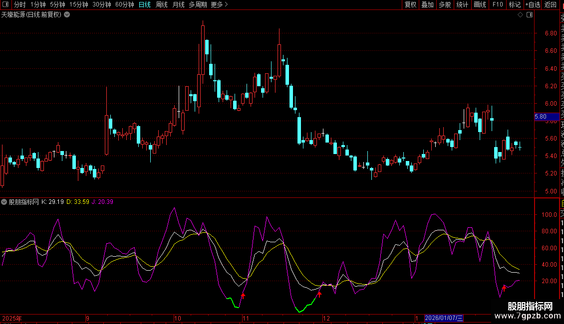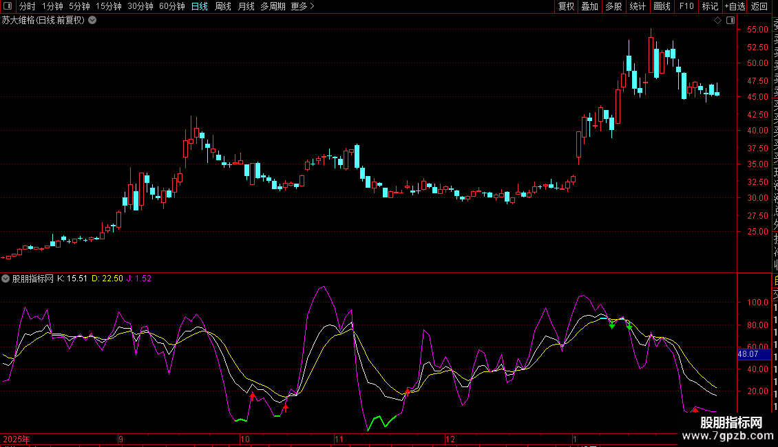 J线超卖信号:当J值小于0时,J线会以加粗的绿色线显示,提示深度超卖区域。