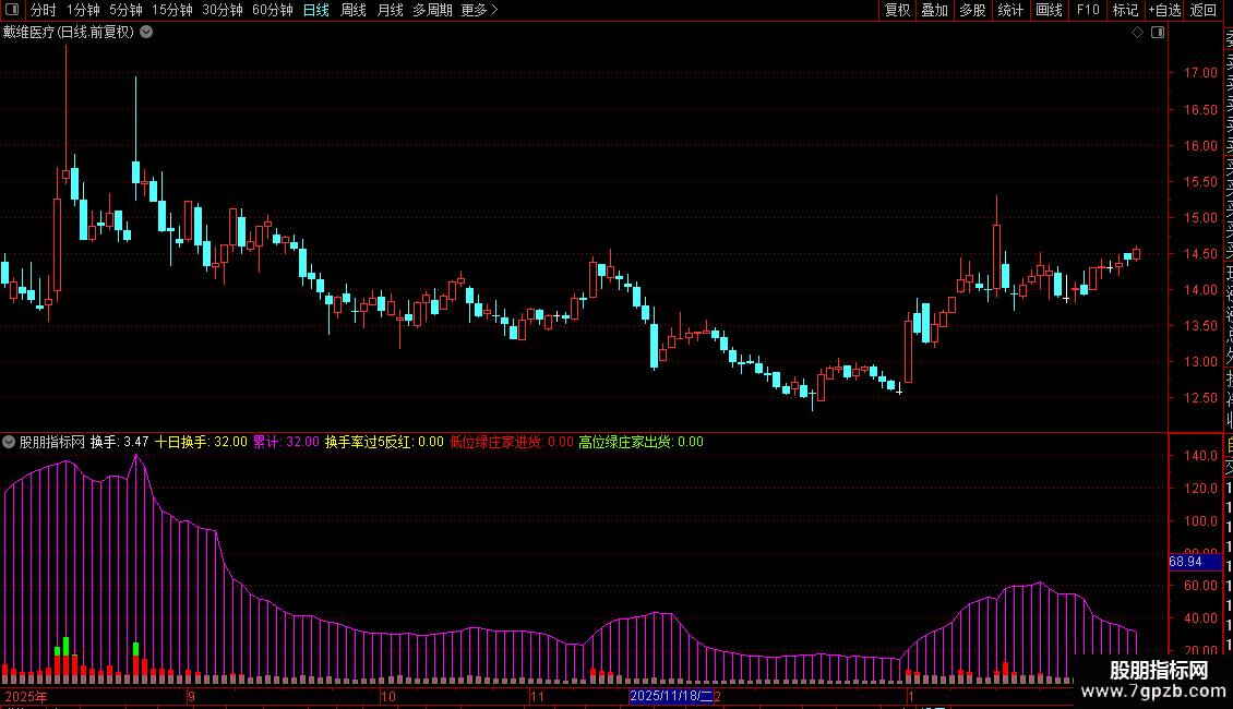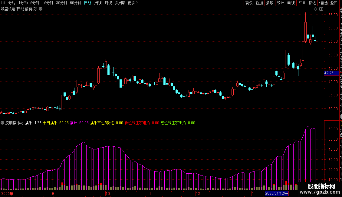 5. 高换手警示柱(红色):当单日换手率大于5%时,在5%的位置至实际换手率位置绘制红色柱状图。