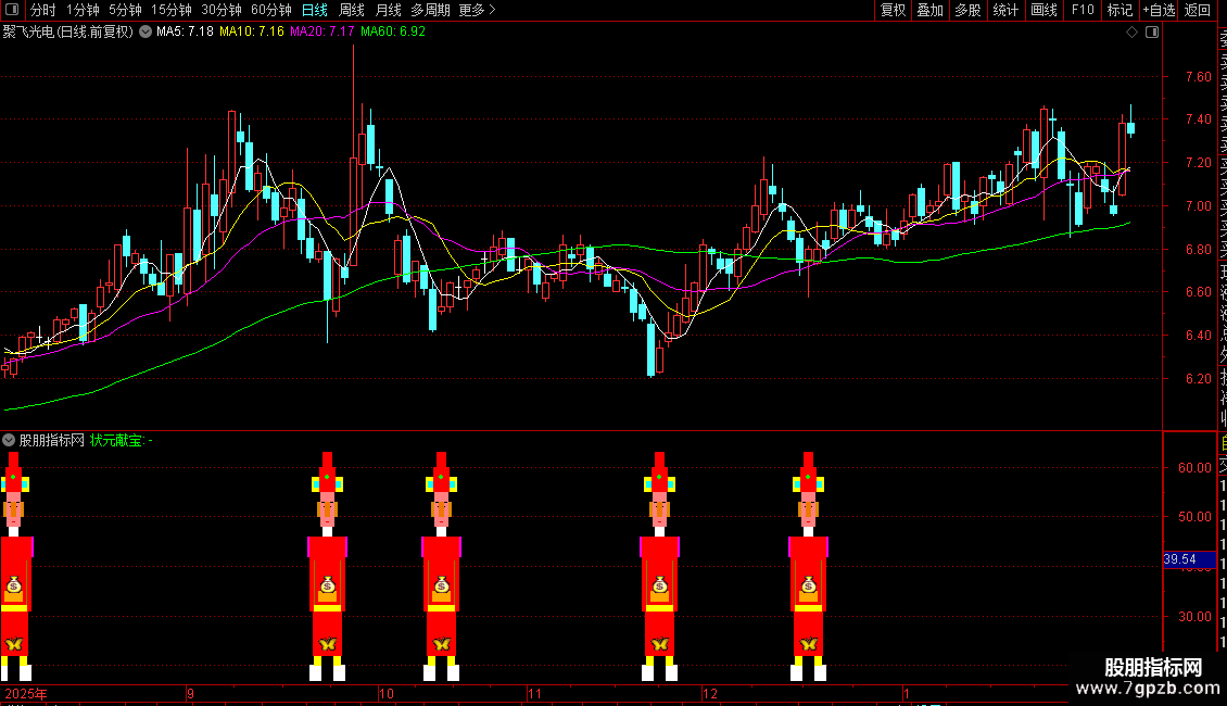 这个副图指标的核心功能是识别股价在短期超卖区域可能出现的反弹或反转信号,称为“状元郎”信号。它在副图区域以醒目的图标和彩色柱线进行标记。