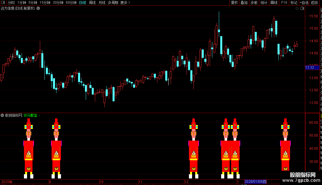 当副图上出现彩色柱状图及绿色“状元献宝”点时,表示“状元郎”信号触发。