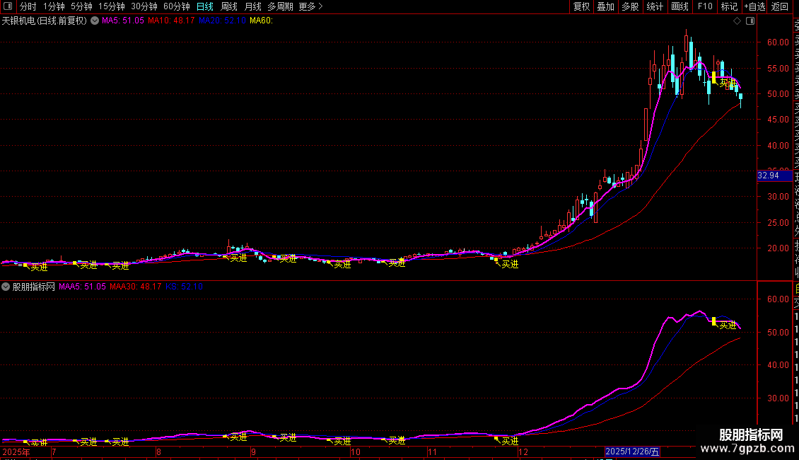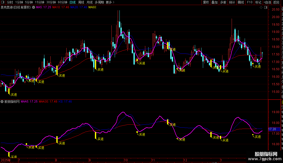 粉色粗线 (MAA5): 5日收盘价均线,代表短期趋势。线体较粗,便于观察。