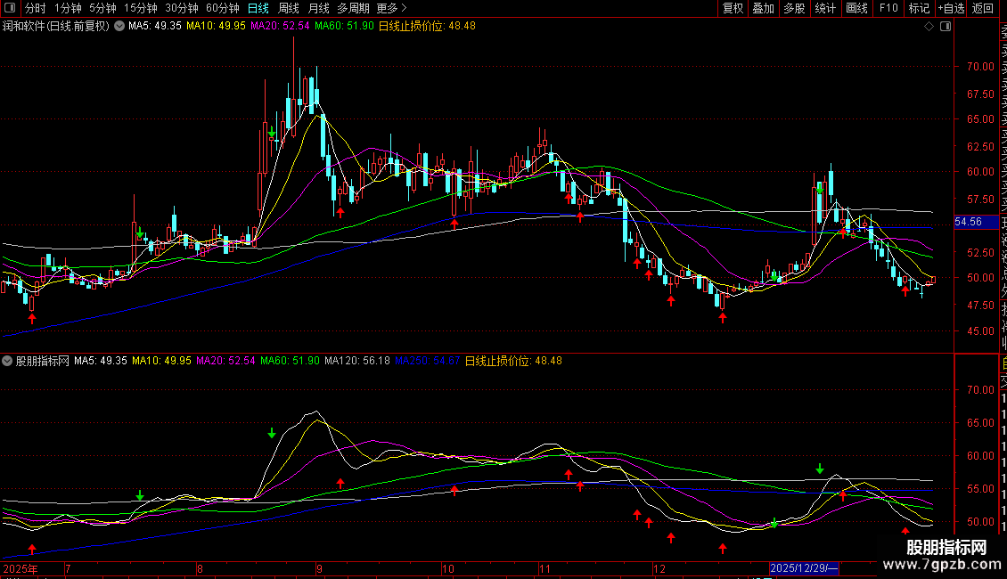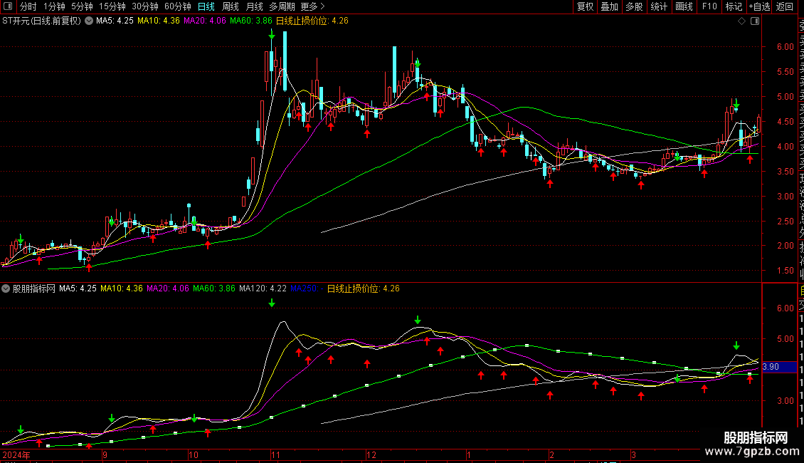 1. 主图显示6条均线:5日、10日、20日、60日、120日、250日收盘价均线。