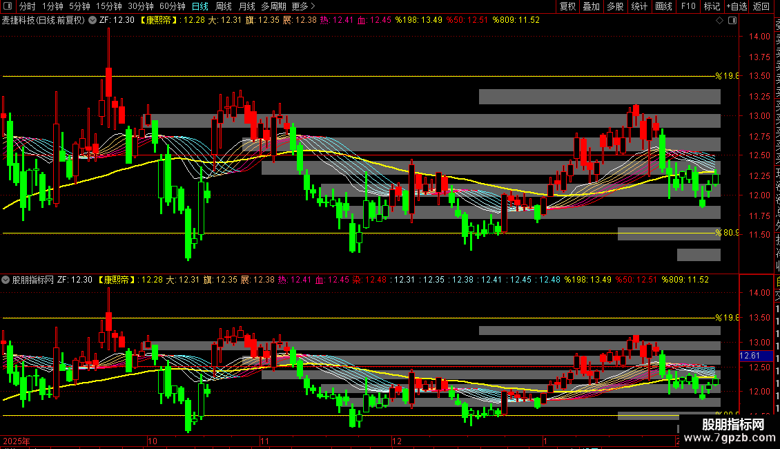 这些均线基于价格变化率的复杂平滑计算衍生而来,用于判断多空趋势。