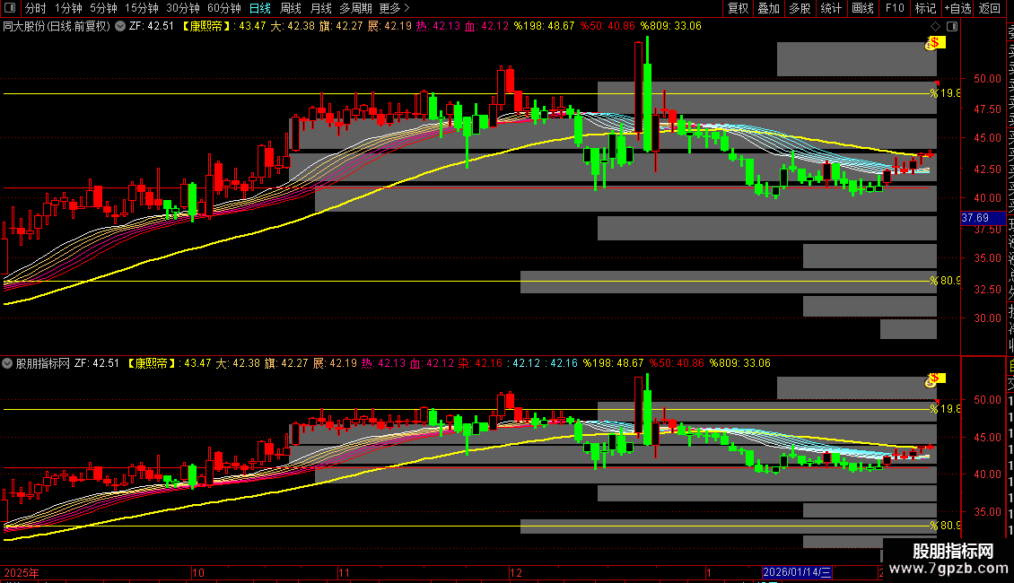 在主图叠加显示一组以“康熙帝”、“大”、“旗”、“展”、“热”、“血”、“染”命名的均线。
