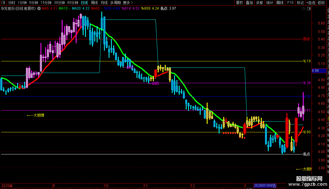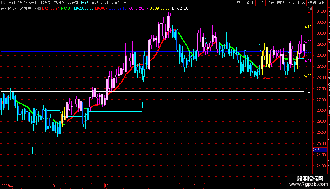 计算最近N(默认80)个周期内的最高价(高)与最低价(低),并以此区间为基准,绘制出19.1%、38.2%、50%、61.8%、80.9% 五条斐波那契回调线,连同“顶点”(区间高点)和“低点”(区间低点)一起,作为重要的支撑阻力位参考。这些水平线在图上以不同颜色标注。