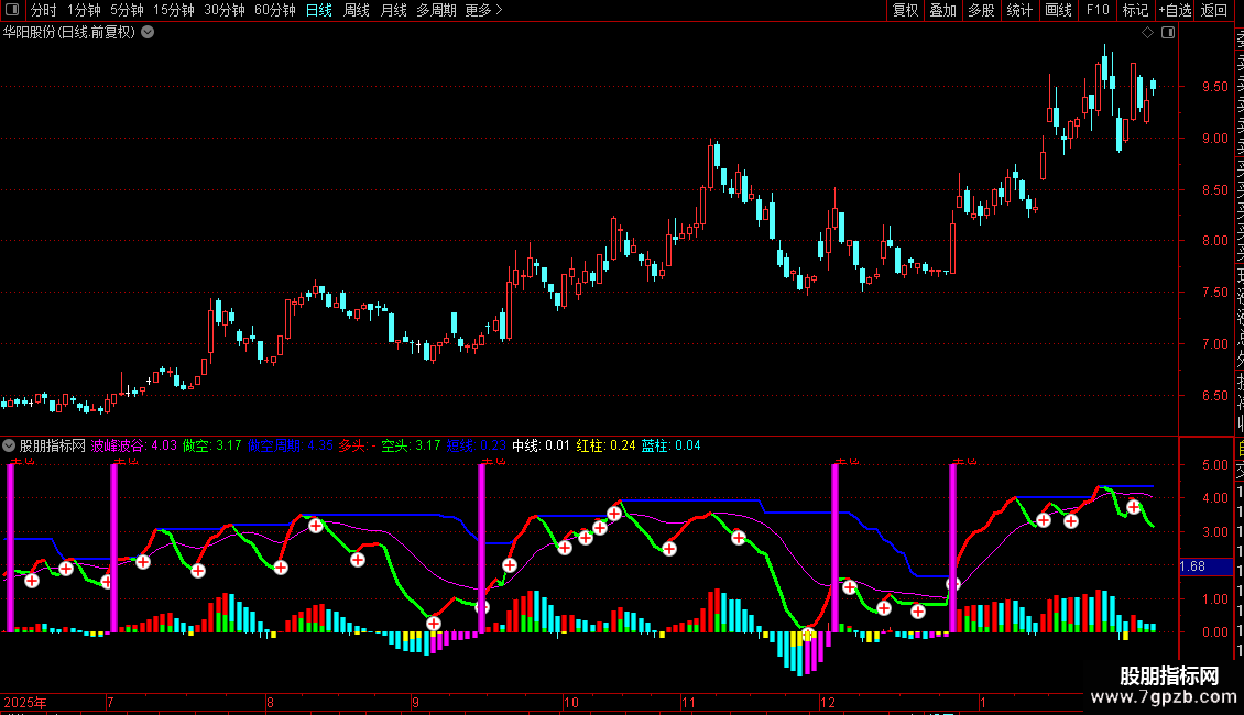 波峰波谷线(粉色): 核心趋势线,反映价格的中期波动节奏。其方向代表主要趋势。