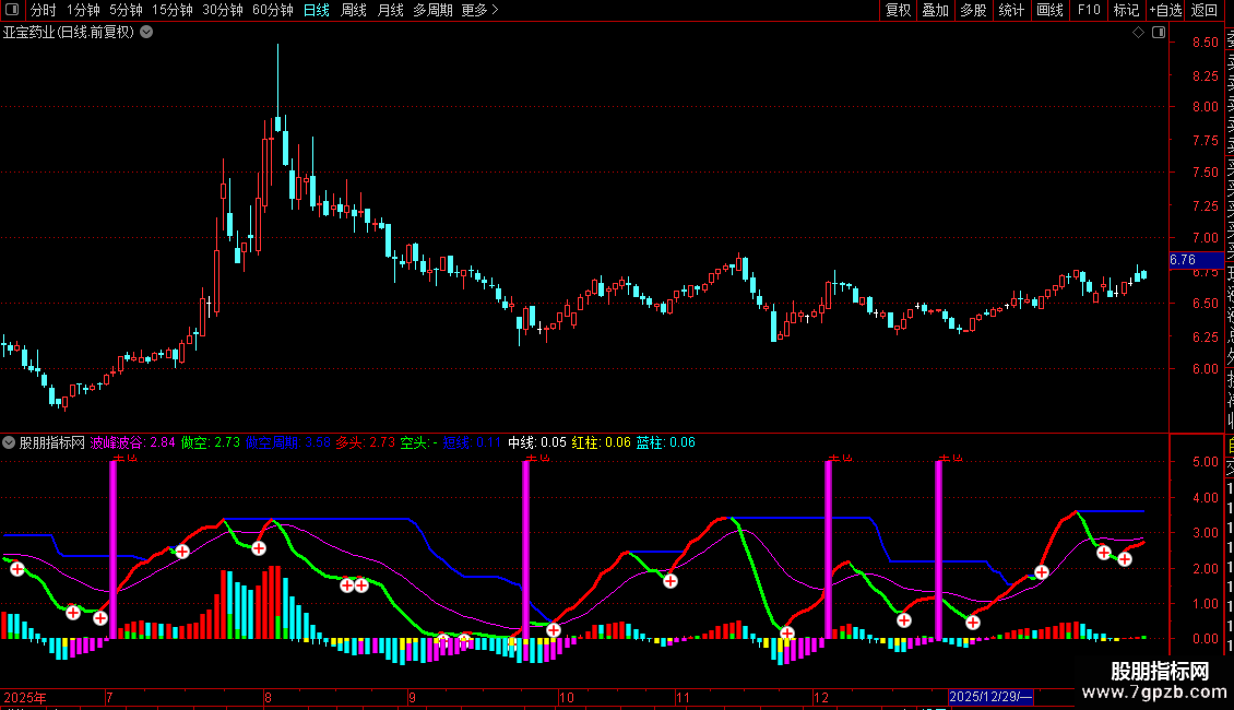 波峰波谷:SMA(拉升力A,3,1),COLORFF00FF;