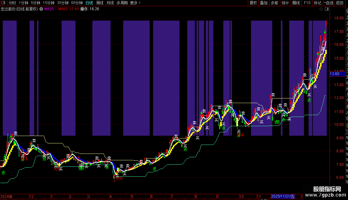买点:当“指导线”上穿“界”,或“买线YGB”上穿“卖线YGB”时,在收盘价位置标记洋红色信号。