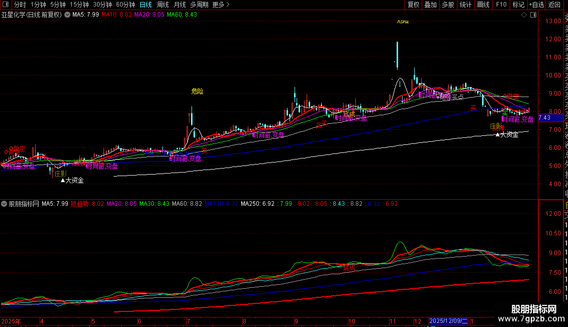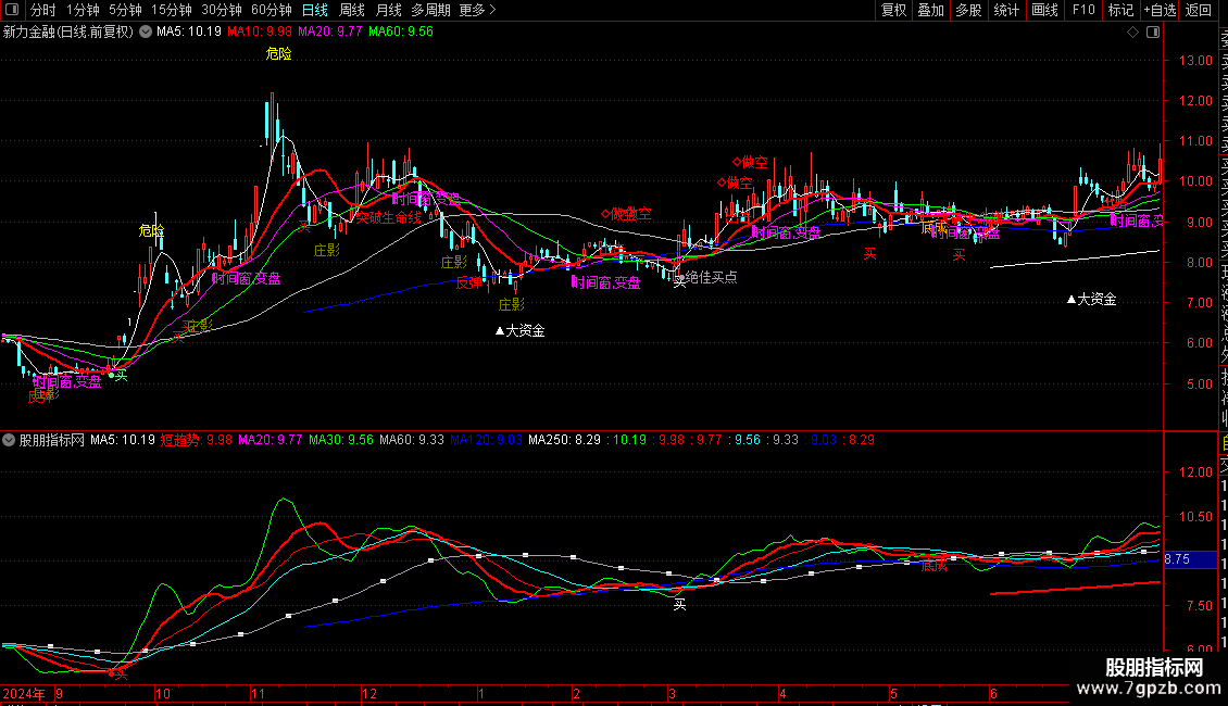 MA20、MA30、MA60、MA120、MA250:分别为20、30、60、120、250日收盘价均线,构成中长期均线系统。