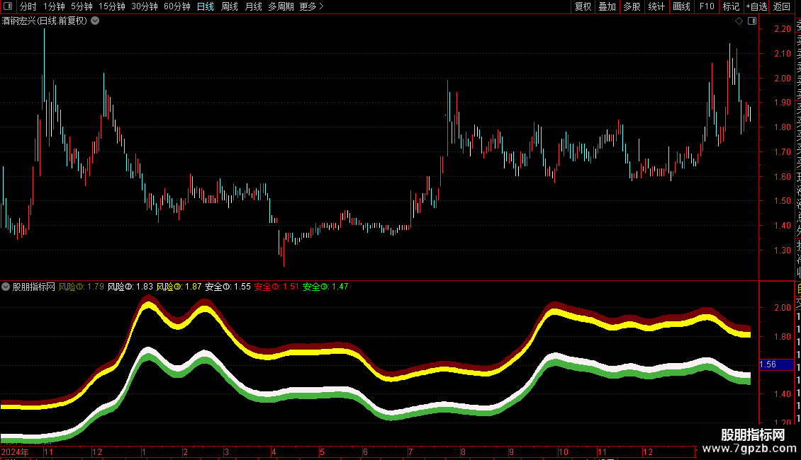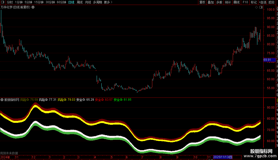 3. 风险与安全区域:以 `运动趋势` 线为基准,上下按固定百分比扩展出六个阈值,形成三个风险带和三个安全带。