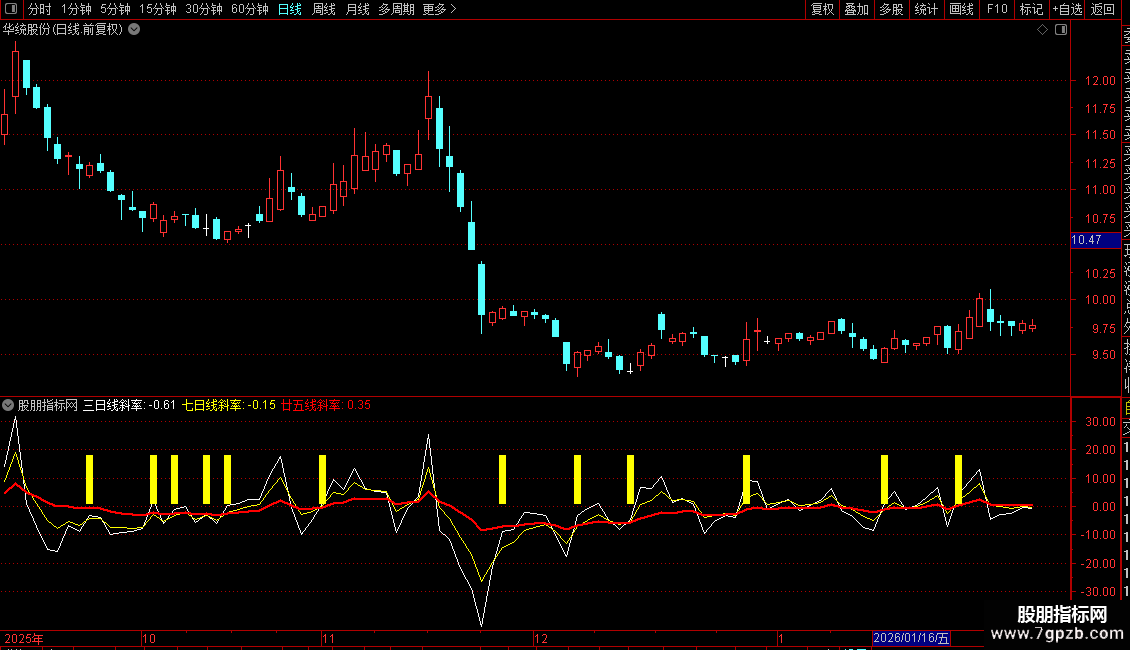 廿五线斜率:基于25日EMA计算,反映长期趋势的斜率变化,以红色粗线显示。