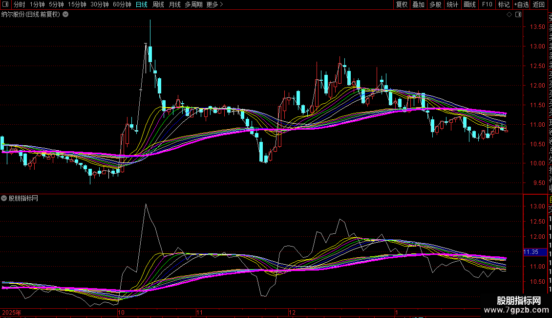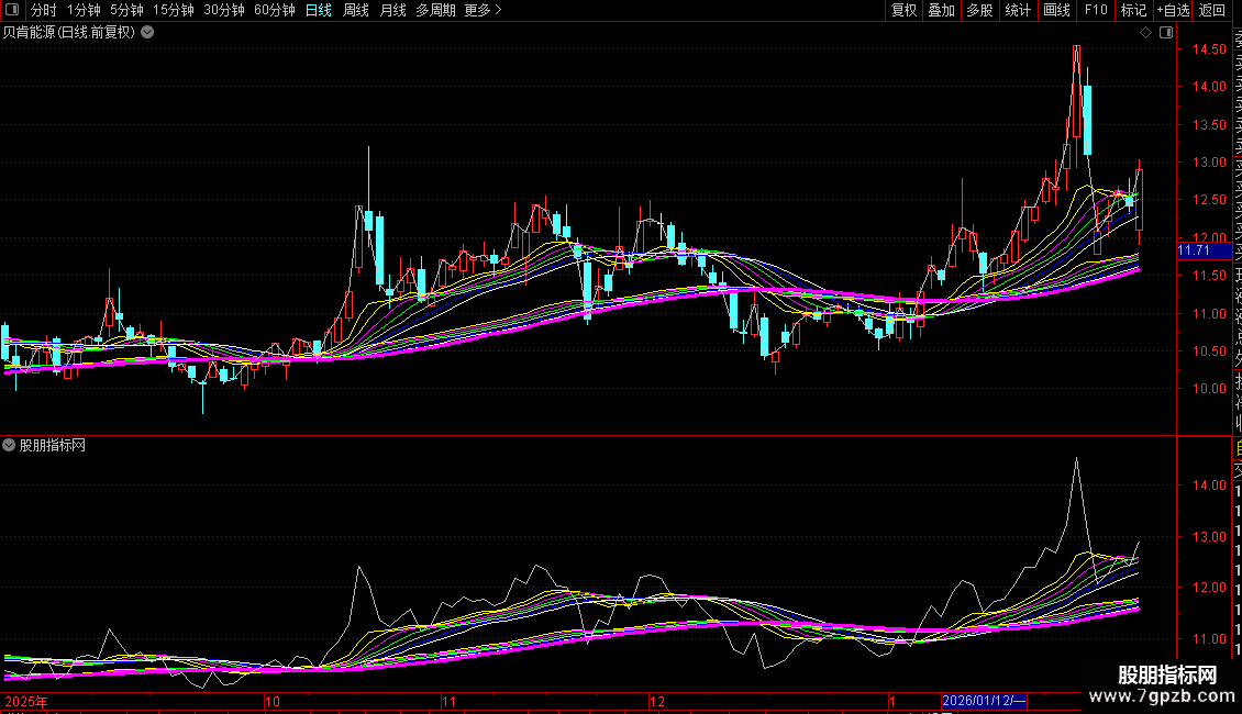 NOTEXT14(EMA60的13周期均线)为品红色粗线。