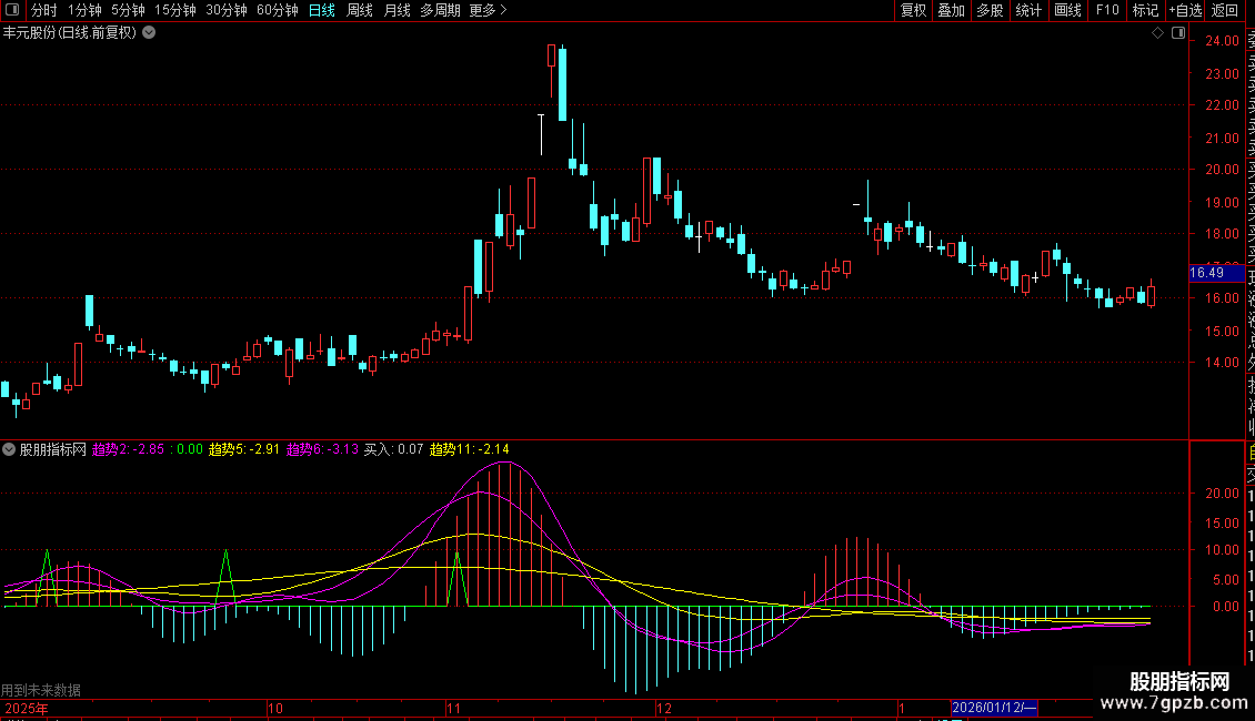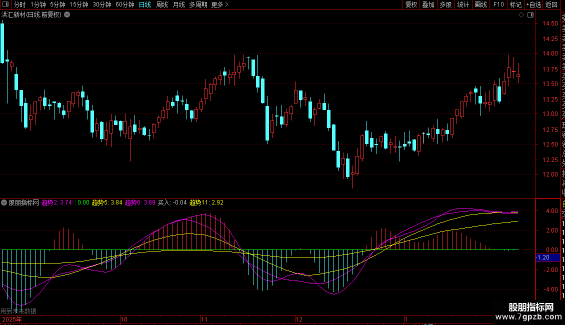 4. 趋势2(洋红色线):对13周期涨跌幅度进行三重XMA平滑,反应中短期趋势。