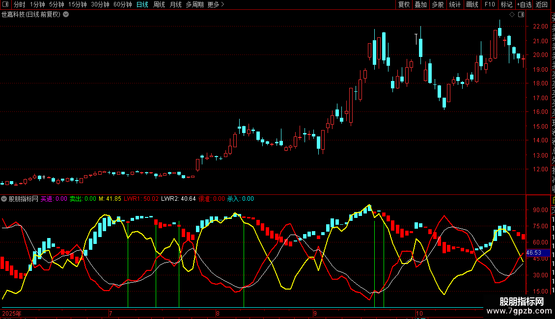 辅助观察:M指标(黄线)的走向可判断短期趋势强弱,LWR指标的金死叉可作为买卖的辅助确认。各指标信号共振时,有效性更高。