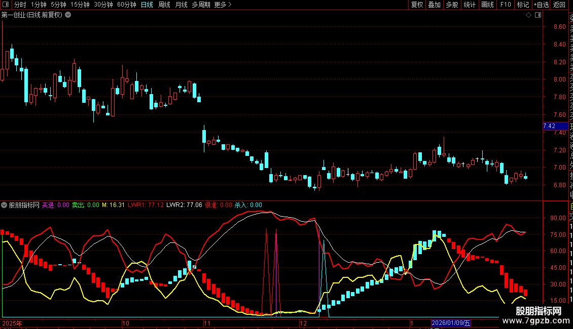 LWR1线:红色粗线,由11日周期的威廉值经3日SMA计算得出。