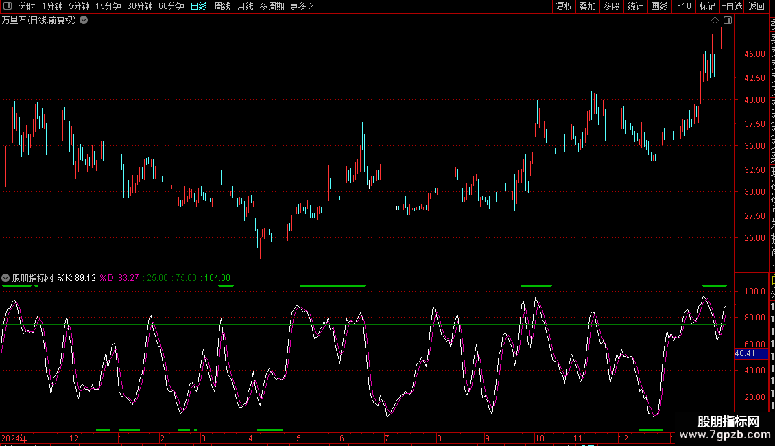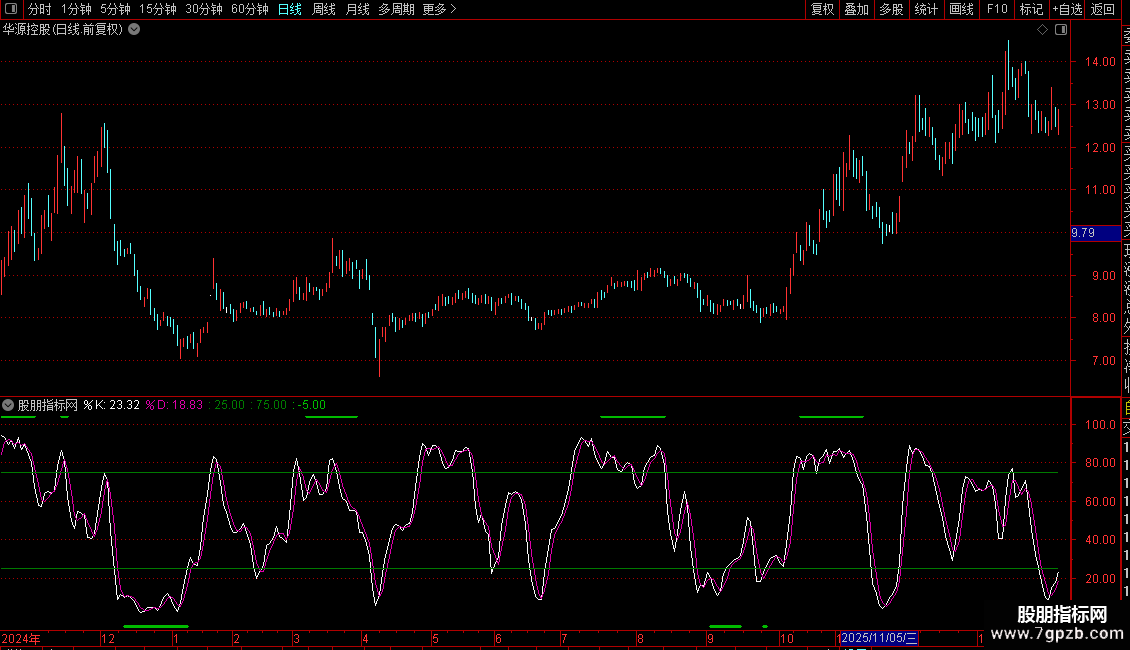在坐标轴上绘制了Y1(25) 和Y2(75) 两条水平参考线,用于标识超卖和超买区域。