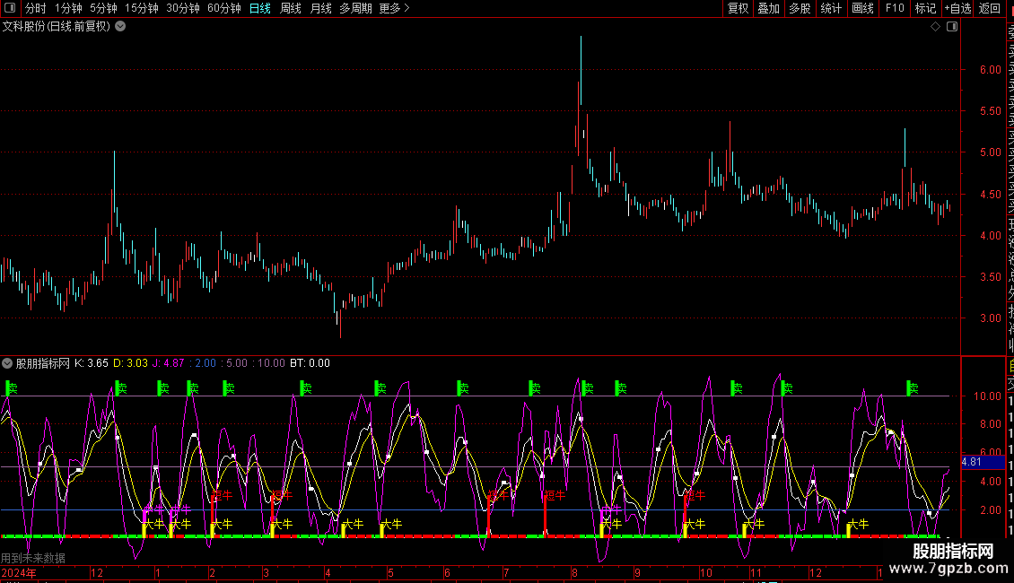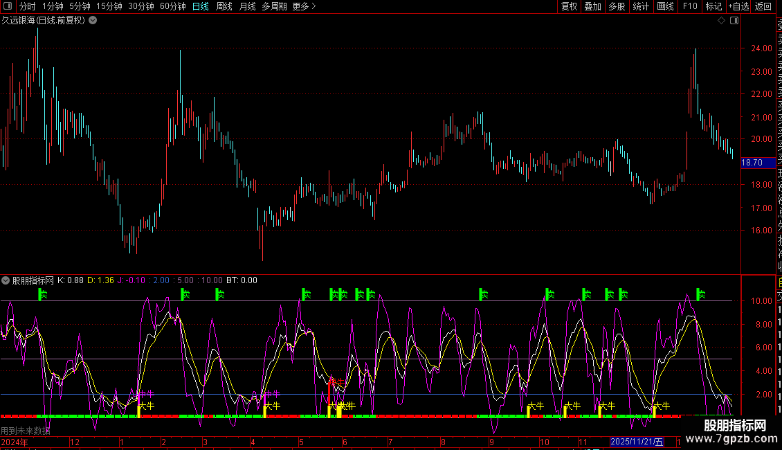 1. 副图指标:在副图区域显示K、D、J线,以及“短牛”、“中牛”、“大牛”买入信号和“卖”出信号。