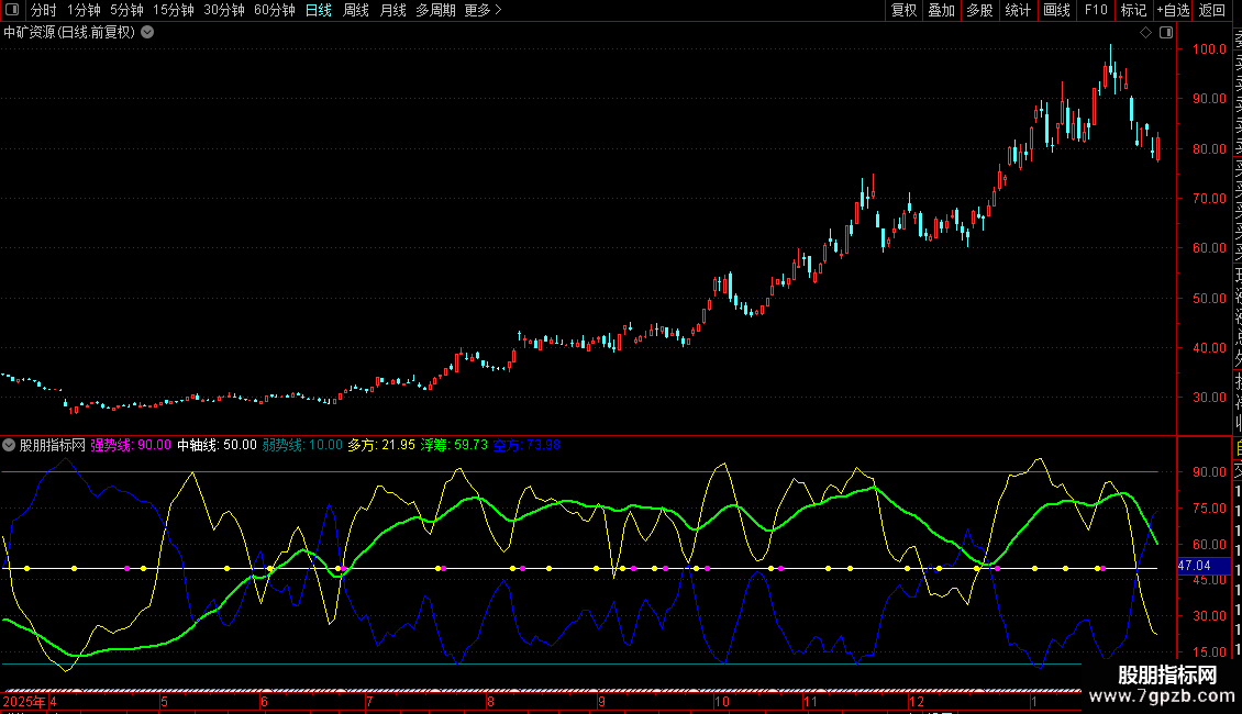 多方(黄线):代表市场做多能量。数值以50为平衡点,大于50表示多方占优,数值越大能量越强;小于50表示多方弱势,数值越低越接近阶段底部。