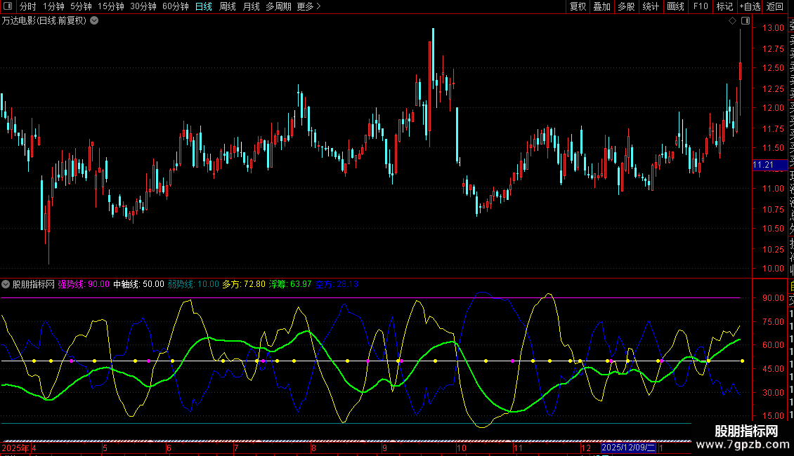 黄线:代表多方的能量值,其数值大小以50作为平衡值,数值越大说明该种能量越大,反之,则越小。