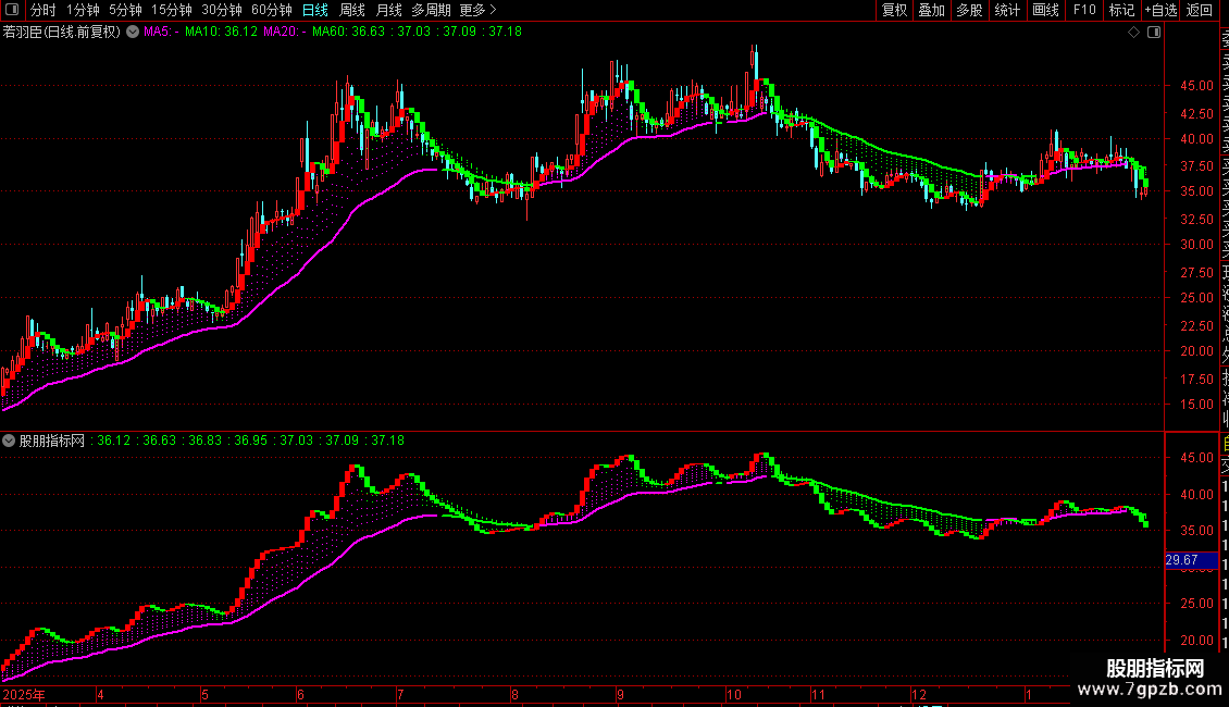 指标通过多条复合均线的预测值及其颜色变化,来展示不同时间维度下价格的趋势方向(洋红色代表向上,绿色代表向下)。