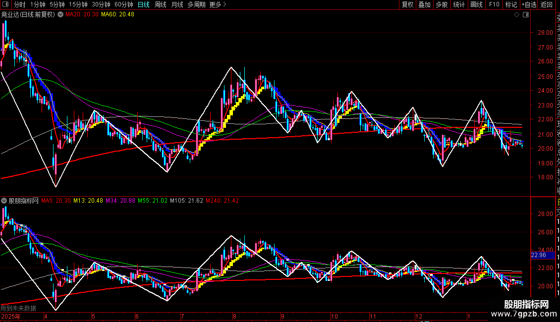 使用白色粗线连接这些有效的高点和低点,在图表上形成类似“分形”或“波浪”的趋势通道线。