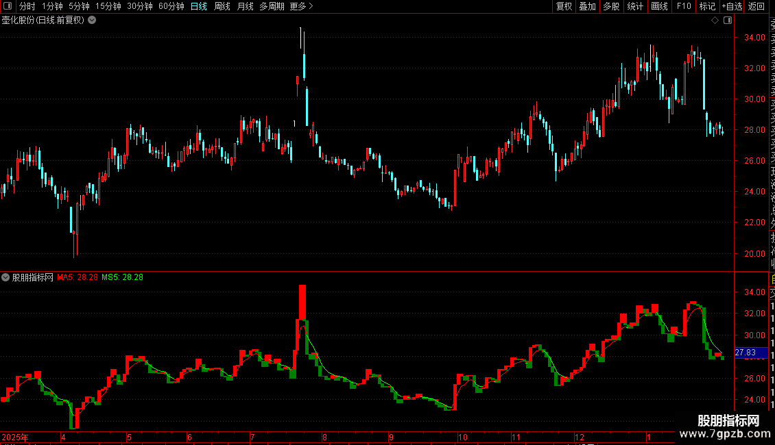 指标为宝塔线指标,包含宝塔线和5日均线。
